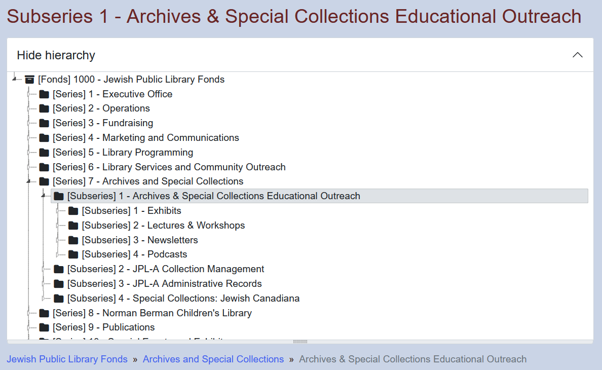In the future, when institutional records are no longer being actively accessed, they may be turned over to an archives. In my case, my records will end up in the Jewish Public Library’s Fonds in our Archives. So this organising work is equally for me, other staff, and researchers decades from now who want to know about the activities of the JPL Archives at this time in history. What they will discover is our desire to showcase a range of voices, identities, and perspectives, particularly those who are traditionally underrepresented within the community and the archives.