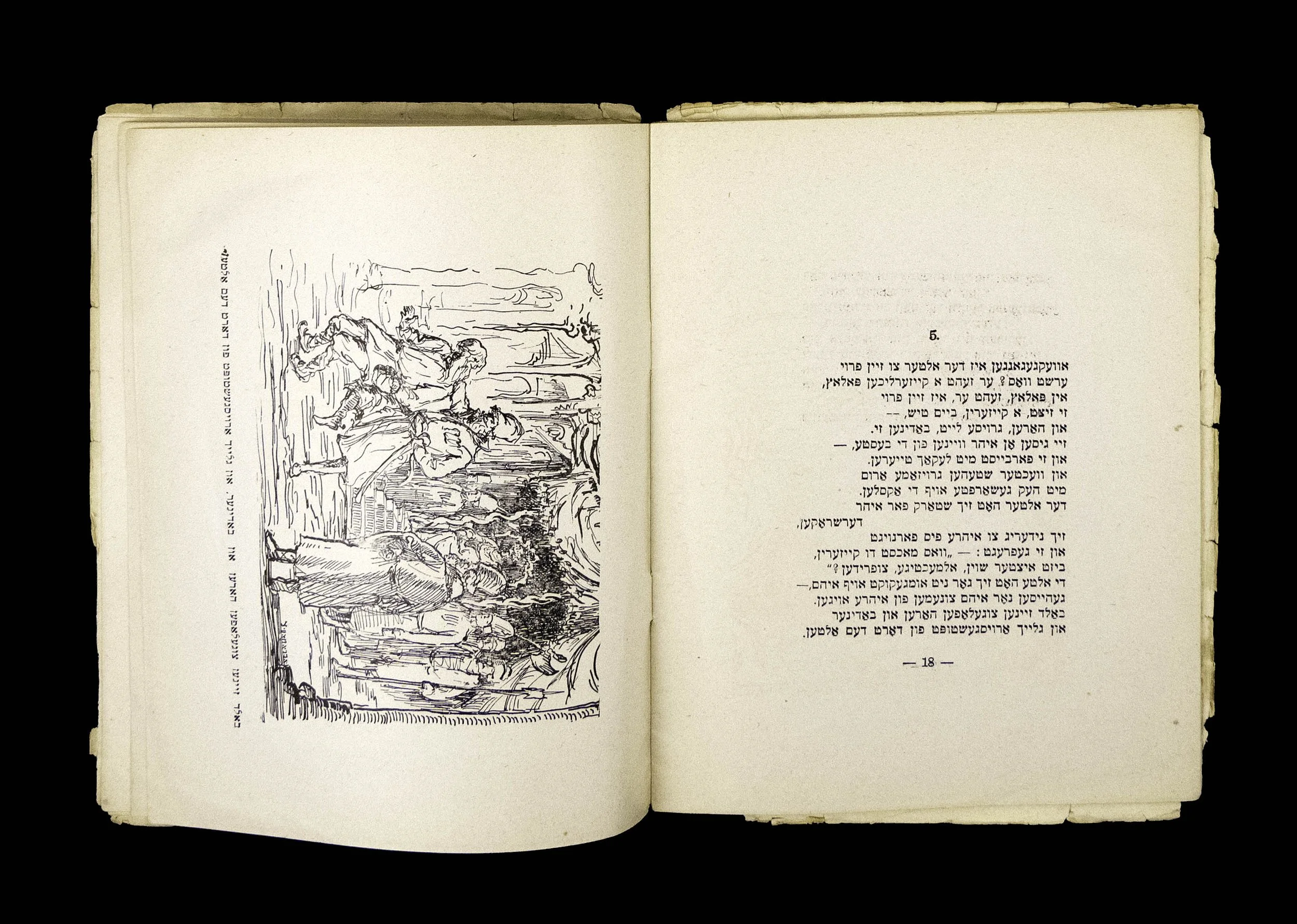 This short book of fourteen pages includes black line drawings on each page illustrating the scenes of the surrounding text. While Der Tunkeler was known to Yiddishize or Judaize the corresponding illustrations to Busch’s texts as well - changing characters’ facial features and garb - it does not appear to have been the case for this story, which doesn’t include any human characters. The style, however, doesn’t match the way Busch often drew either animal, which feature frequently in his stories, so it can be assumed that while Der Tunkeler didn’t adjust Busch’s depictions, he did re-illustrate the scenes for his translation.
